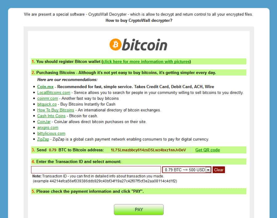You are asked to purchase a special software called a CryptoWall Decrypter, using Bitcoin, which is supposed to allow you to decrypt your files.